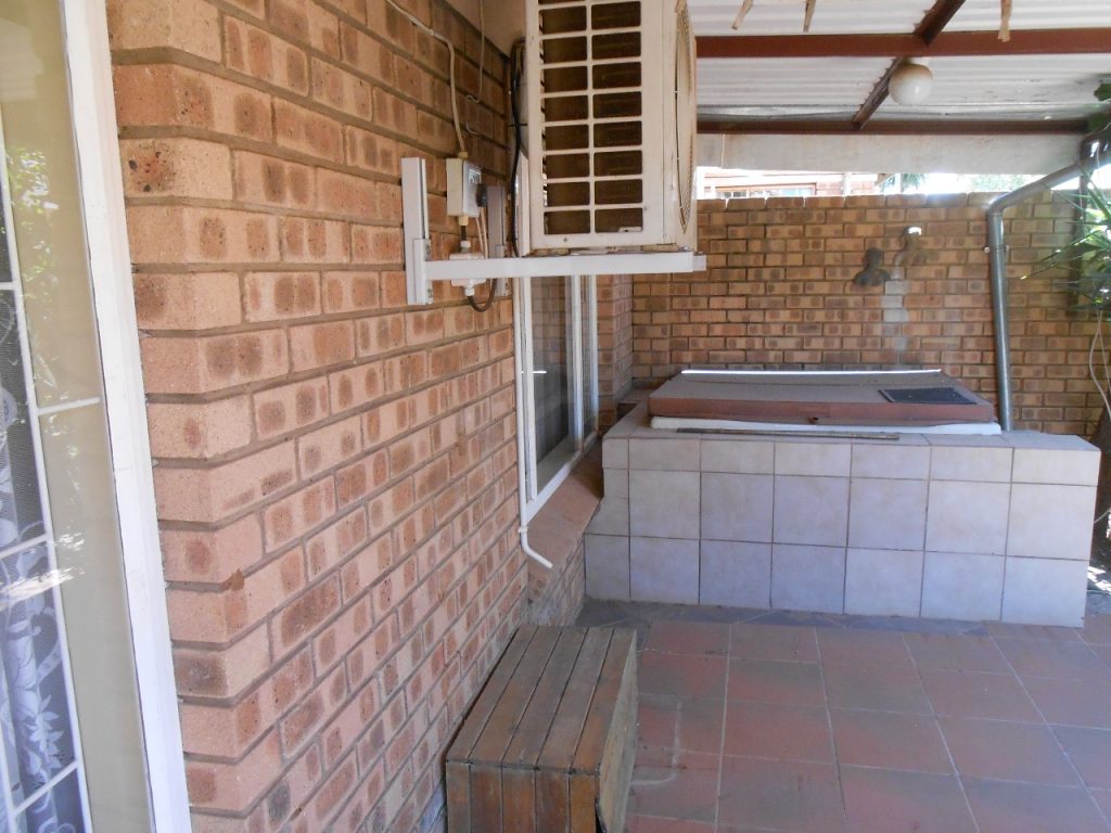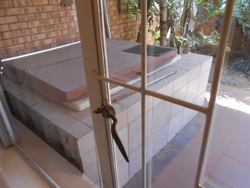 Die eiendom staan tans leeg met 3 slaapkamers, onlangs geverf, teëls en matte in slaap kamers. 2 x Afdakke. Waaiers met aircon in die hoof slaap kamer. Die kombuis vol kaste met water suiweraar. Vloer en muur Teëls in goeie toestand en hangkaste in kamers. n onderdak jacuzi op die agterstoep binne privaat ruimte. Mure rondom die perseel en plaveisel aan ingang met skadu nette by ingang hekke.